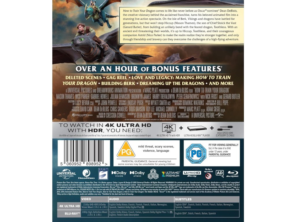 Toho jsou schopny pouze ty nejmodernější kamery, což jsou v tomto případě Arri Alexa 35 a Arri Alexa LF IMAX. Postprodukce těchto materiálů samozřejmě probíhala kompletně ve 4k. "Uhlazené" vizuály Jak vycvičit draka na 4k Ultra HD Blu-ray pravděpodobně vyniknou více než v kinech. Pokud přidáme fakt, že na UHDBD dostáváme také proměnný poměr stran, kdy se některé scény "rozevírají" do IMAXovského 1.90:1, lze čekat vizuální orgie a technickou dokonalost.