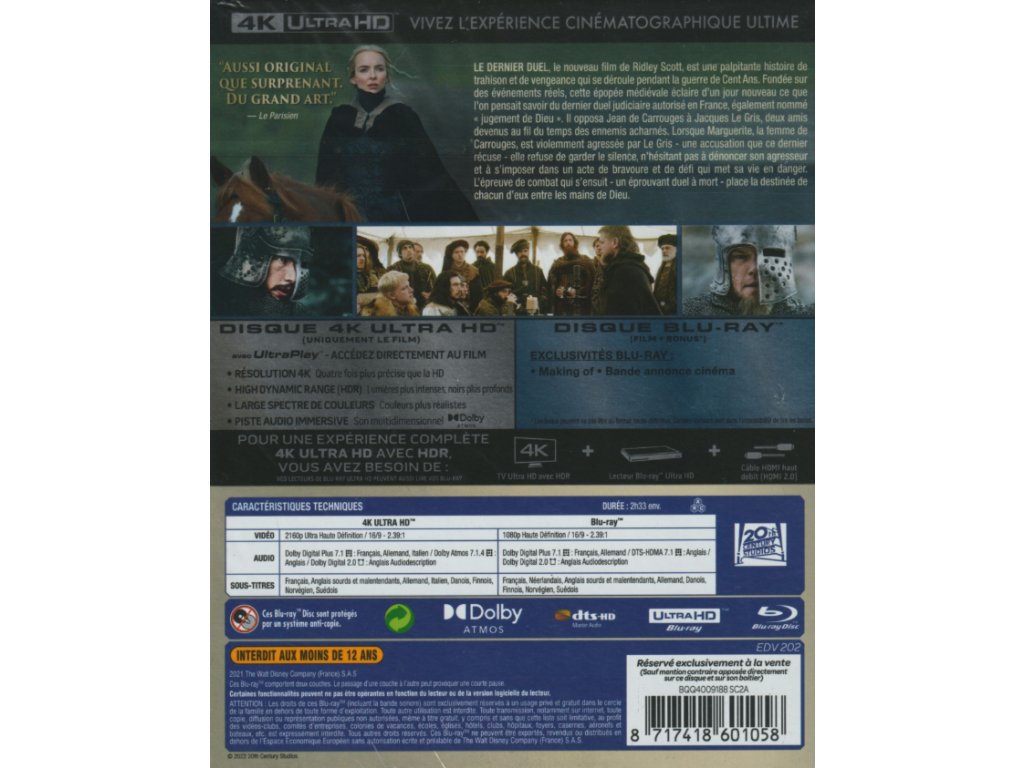 Ano. Poslední souboj je další produkt hollywoodského trendu, v jehož rámci se větší produkce natáčejí na čerstvé modely digitálních kamer Arri Alexa s modelovým označením LF. Jsou to velkoformátové kamery, jejichž nativní záznam má rozlišení 4.5k a mají špičkové obrazové parametry. Když se pak film postprodukuje ve 4k, což je i případ Scottova nového celovečeráku, který má nativní 4k master, těží distribuční kopie z vizuálních kvalit takového záznamu naprosté maximum. Od Posledního souboje díky tomu nelze čekat nic jiného než maximální obrazové kvality, které jsou vedle ohromného rozlišení podpořeny pro UHD formát standardní dvojkou rozšířeného barevného a jasového gamutu, tedy WCG a HDR. Ty v tomto případě pomáhají především pevnější kresbě v hůře svícených scénách, kde by SDR už bylo o krok pozadu.